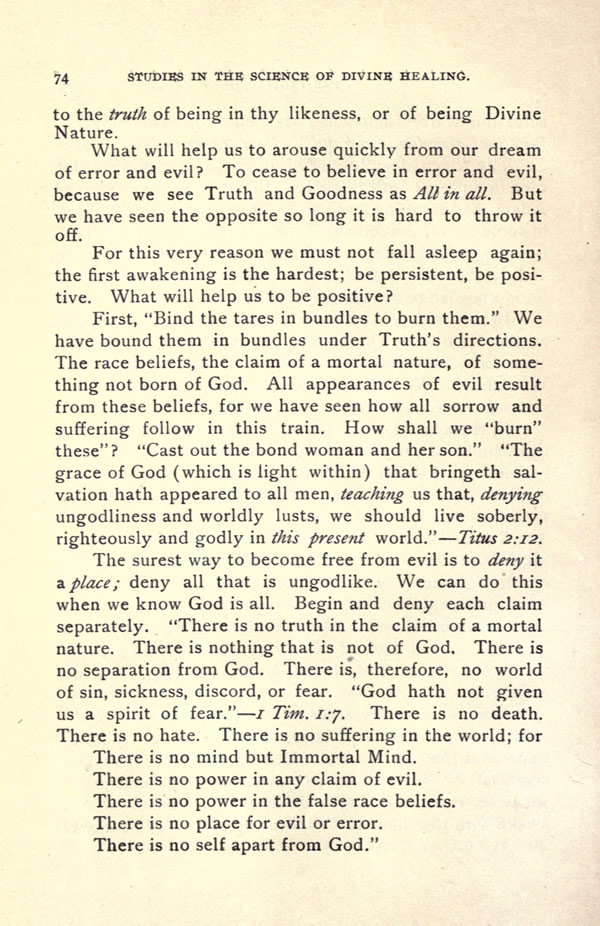 The surest way to become free from evil is to deny it a place; deny all that is ungodlike. We can do this when we know God is all. Begin and deny each claim separately. "There is no truth in the claim of a mortal nature. There is nothing that is not of God. There is no separation from God. There is, therefore, no world of sin, sickness, discord, or fear. "God hath not given us a spirit of fear." -- I Tim. 1:7. There is no death. There is no hate. There is no suffering in the world; for