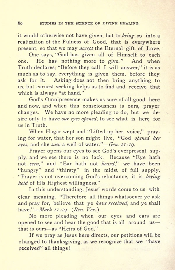 One says, "God has given all of Himself to each one. He has nothing more to give." And when Truth declares, "Before they call I will answer," it is as much as to say, everything is given them, before they ask for it. Asking does not then bring anything to us, but earnest seeking helps us to find and receive that which is always "at hand."