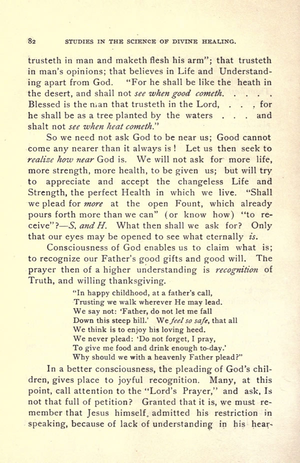 Consciousness of God enables us to claim what is; to recognize our Father's good gifts and good will. The prayer then of a higher understanding is recognition of Truth, and willing thanksgiving.
