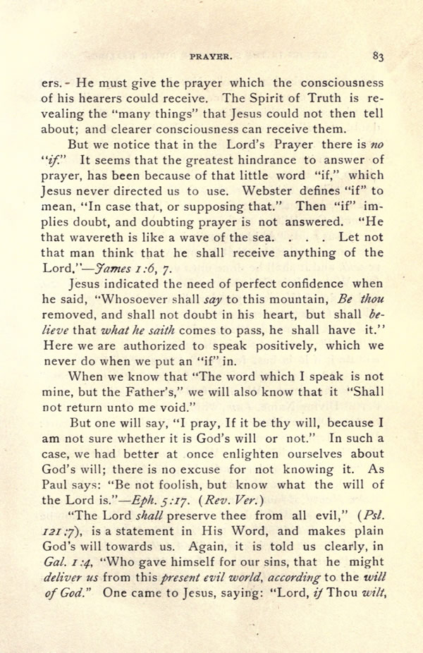 But we notice that in the Lord's Prayer there is no "if." It seems that the greatest hindrance to answer of prayer, has been because of that little word "if," which Jesus never directed us to use. Webster defines "if" to mean, "In case that, or supposing that." Then "if" implies doubt, and doubting prayer is not answered. "He that wavereth is like a wave of the sea. . . . Let not that man think that he shall receive anything of the Lord." -- James 1:6, 7.