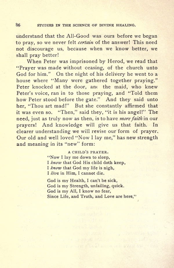 When Peter was imprisoned by Herod, we read that "Prayer was made without ceasing, of the church unto God for him." On the night of his delivery he went to a house where "Many were gathered together praying." Peter knocked at the door, and the maid, who knew Peter's voice, ran in to those praying, and "Told them how Peter stood before the gate." And they said unto her,"Thou art mad!" But she constantly affirmed that it was even so. "Then," said they, "it is his angel!" The need, just as truly now as then, is to have more faith in our prayers! And knowledge will give us that faith. In clearer understanding we will revise our form of prayer. Our old and well loved "Now I lay me," has new strength and meaning in its "new" form:
