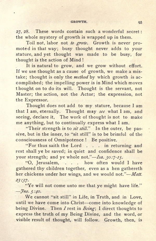 Toil not, labor not to grow. Growth is never promoted in that way; busy thought never adds to your stature, and yet thought was made to be busy, for thought is the action of Mind!