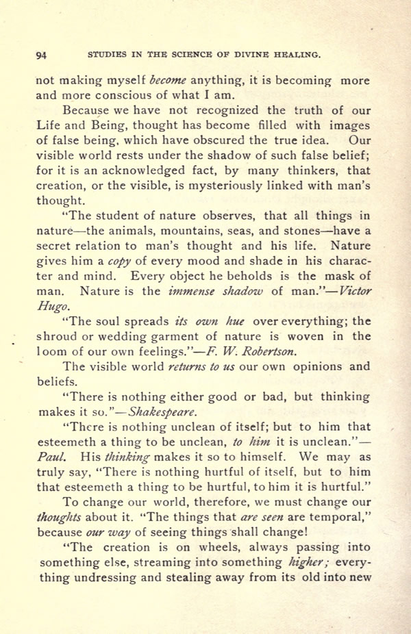 Because we have not recognized the truth of our Life and Being, thought has become filled with images of false being, which have obscured the true idea. Our visible world rests under the shadow of such false belief; for it is an acknowledged fact, by many thinkers, that creation, or the visible, is mysteriously linked with man's thought.