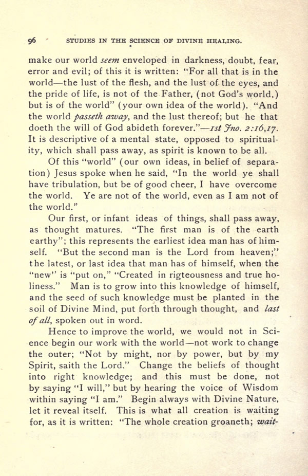 make our world seem enveloped in darkness, doubt, fear, error and evil; of this it is written. "For all that is in the world -- the lust of the flesh, and the lust of the eyes, and the pride of life, is not of the Father, (not God's world.) but is of the world" (your own idea of the world). "And the world passeth away, and the lust thereof; but he that doeth the will of God abideth forever." -- Ist Jno. 2:16,17. It is descriptive of a mental state, opposed to spirituality, which shall pass away, as spirit is known to be all.