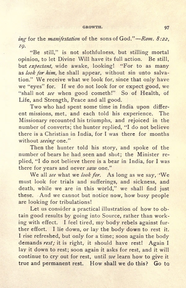 "Be still," is not slothfulness, but stilling mortal opinion, to let Divine Will have its full action. Be still, but expectant, wide awake, looking! "For to as many as look for him, he shall appear, without sin unto salvation." We receive what we look for, since that only have we "eyes" for. If we do not look for or expect good, we "shall not see when good cometh!" So of Health, of Life, and Strength, Peace and all good.