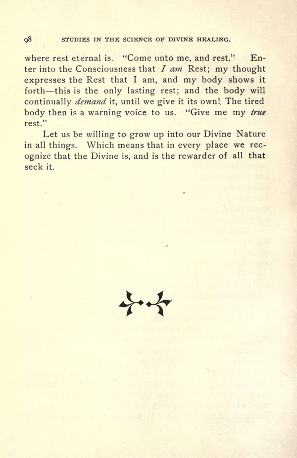 where rest eternal is. "Come unto me, and rest." Enter into the Consciousness that I am Rest; my thought expresses the Rest that I am, and my body shows it forth -- this is the only lasting rest; and the body will continually demand it, until we give it its own!. The tired body then is a warning voice to us. "Give me my true rest."