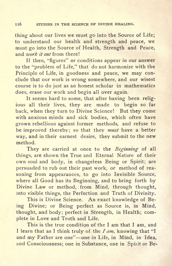 It seems hard to some, that after having been religious all their lives, they are made to begin so far back, when they turn to Divine Science! But they come with anxious minds and sick bodies, which often have grown rebellious against former methods, and refuse to be improved thereby; so that they must have a better way, and in their earnest desire, they submit to the new method.
