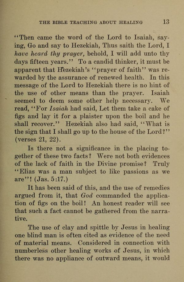 "Then came the word of the Lord to Isaiah, saying, Go and say to Hezekiah, Thus saith the Lord, I have heard thy prayer, behold, I will add unto thy days fifteen years." To a candid thinker, it must be apparent that Hezekiah's "prayer of faith" was rewarded by the assurance of renewed health. In this message of the Lord to Hezekiah there is no hint of the use of other means than the prayer. Isaiah seemed to deem some other help necessary. We read, "For Isaiah had said, Let them take a cake of figs and lay it for a plaister upon the boil and he shall recover. Hezekiah also had said, What is the sign that I shall go up to the house of the Lord?" (verses 21, 22).