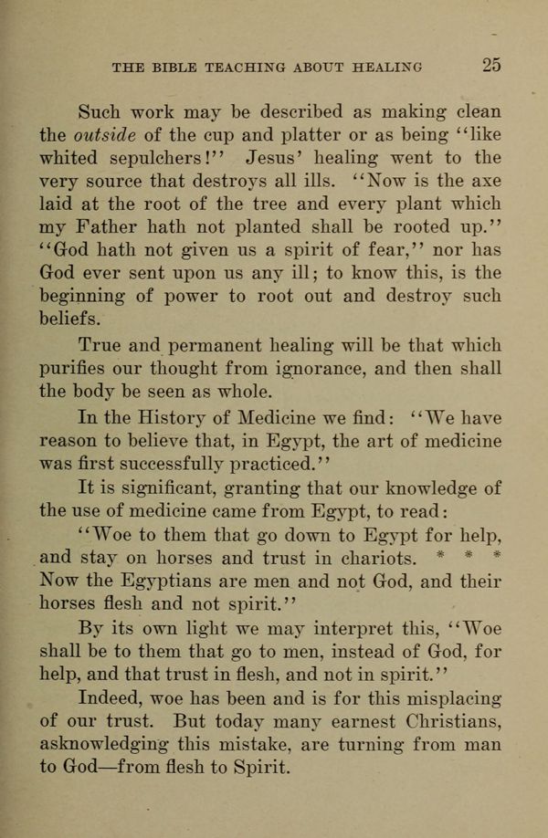 Such work may be described as making clean the outside of the cup and platter or as being "like whited sepulchers!" Jesus' healing went to the very source that destroys all ills. "Now is the axe laid at the root of the tree and every plant which my Father hath not planted shall be rooted up." "God hath not given us a spirit of fear," nor has God ever sent upon us any ill, to know this, is the beginning of power to root out and destroy such beliefs.