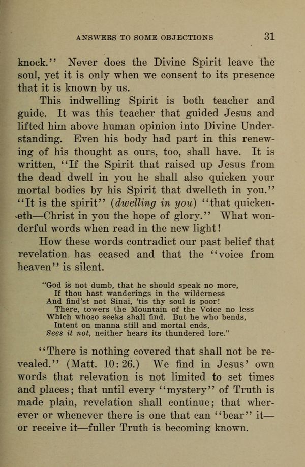This indwelling Spirit is both teacher and guide. It was this teacher that guided Jesus and lifted him above human opinion into Divine Understanding. Even his body had part in this renewing of his thought as ours, too, shall have. It is written, "If the Spirit that raised up Jesus from the dead dwell in you he shall also quicken your mortal bodies by his Spirit that dwelleth in you." "It is the Spirit" (dwelling in you) "that quickeneth --- Christ in you the hope of glory." What wonderful words when read in the new light