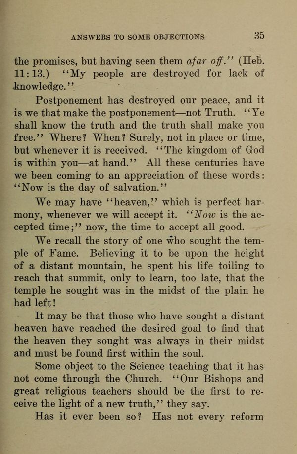 Postponement has destroyed our peace, and it is we that make the postponement --- not Truth. "Ye shall know the truth and the truth shall make you free." Where? When? Surely, not in place or time, but whenever it is received. "The kingdom of God is within you --- at hand." All these centuries have we been coming to an appreciation of these words: "Now is the day of salvation."