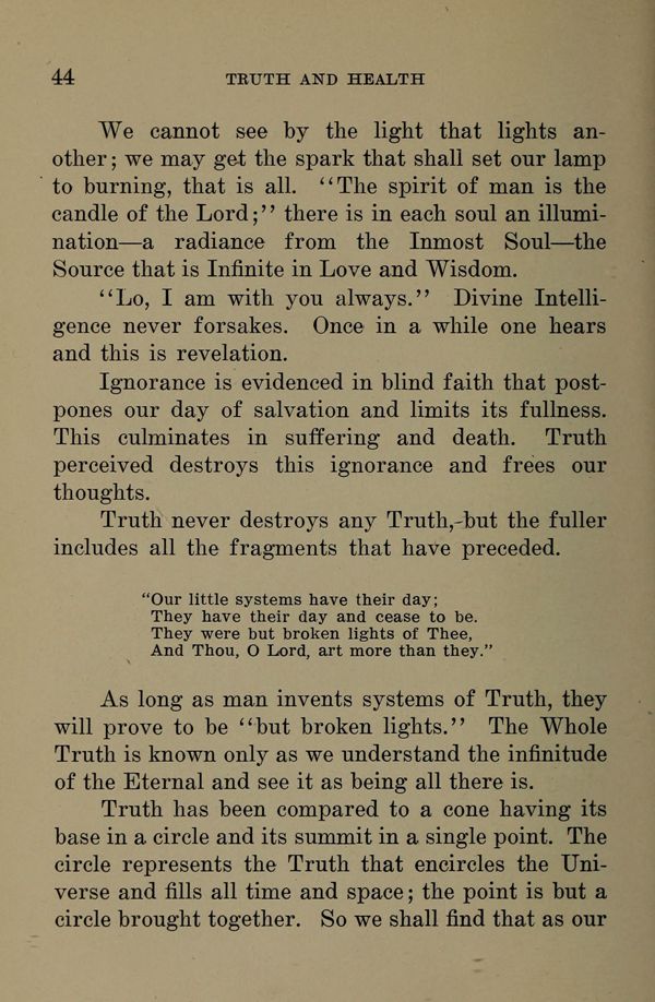 As long as man invents systems of Truth, they will prove to be "but broken lights." The Whole Truth is known only as we understand the infinitude of the Eternal and see it as being all there is.