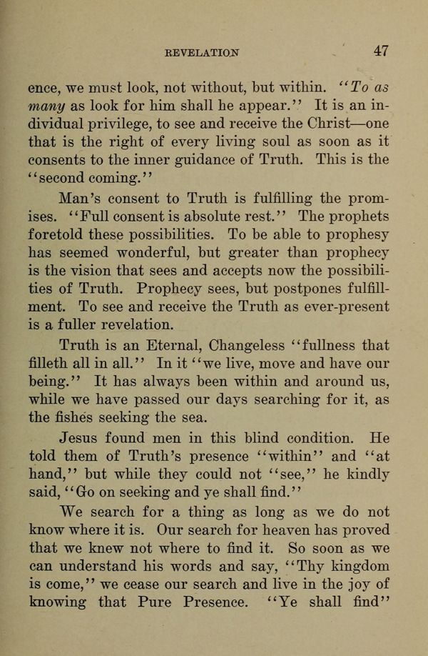 To receive the first evidence of Truth's presence we must look, not without, but within. "To as many as look for him shall he appear." It is an individual privilege, to see and receive the Christ --- one that is the right of every living soul as soon as it consents to the inner guidance of Truth. This is the "second coming."