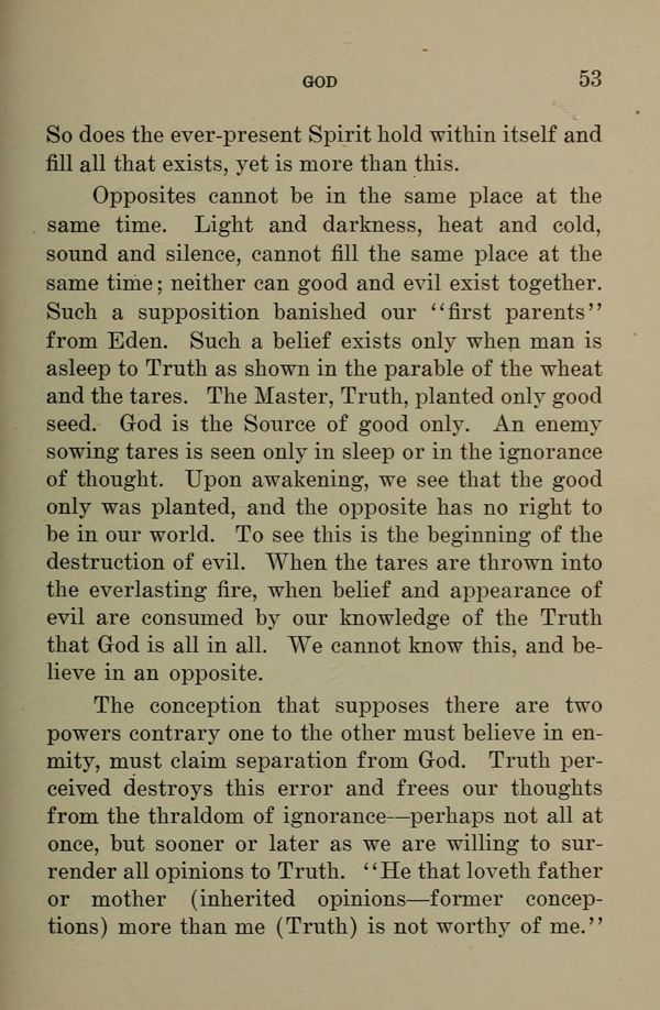 Opposites cannot be in the same place at the same time. Light and darkness, heat and cold, sound and silence, cannot fill the same place at the same time; neither can good and evil exist together. Such a supposition banished our "first parents" from Eden. Such a belief exists only when man is asleep to Truth as shown in the parable of the wheat and the tares. The Master, Truth, planted only good seed. God is the Source of good only. An enemy sowing tares is seen only in sleep or in the ignorance of thought. Upon awakening, we see that the good only was planted, and the opposite has no right to be in our world. To see this is the beginning of the destruction of evil. When the tares are thrown into the everlasting fire, when belief and appearance of evil are consumed by our knowledge of the Truth - that God is all in all. We cannot know this, and believe in an opposite.