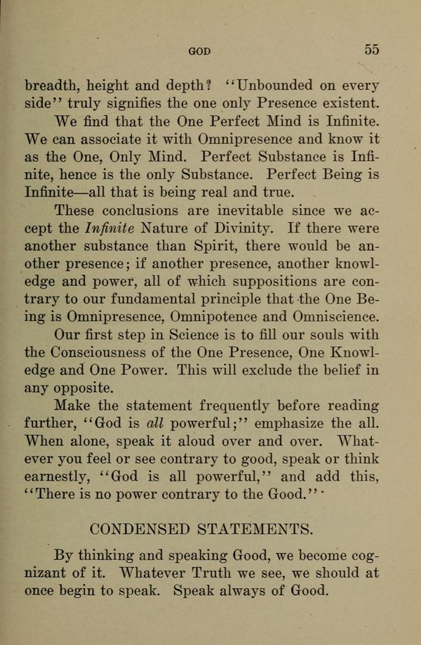 Make the statement frequently before reading further, "God is all powerful"; emphasize the all. When alone, speak it aloud over and over. Whatever you feel or see contrary to good, speak or think earnestly, "God is all powerful," and add this, "There is no power contrary to the Good."