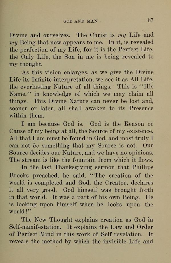 The New Thought explains creation as God in Self-manifestation. It explains the Law and Order of Perfect Mind in this work of Self-revelation. It reveals the method by which the invisible Life and