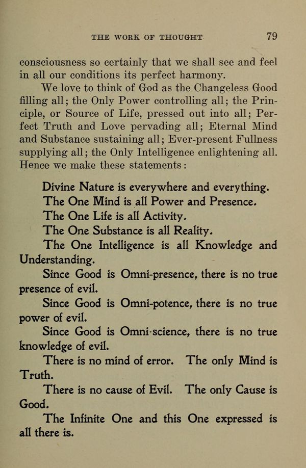 Divine Nature is everywhere and everything. The One Mind is all Power and Presence. The One Life is all Activity. The One Substance is all Reality. The One Intelligence is all Knowledge and Understanding. Since Good is Omni-presence, there is no true presence of evil. Since Good is Omni-potence, there is no true power of evil. Since Good is Omni-science, there is no true knowledge of evil. There is no mind of error. The only Mind is Truth. There is no cause of evil. The only Cause is Good. The Infinite One and this One expressed is all there is.
