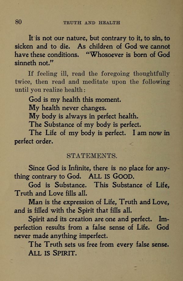 If feeling ill, read the foregoing thoughtfully twice, then read and meditate upon the following until you realize health: