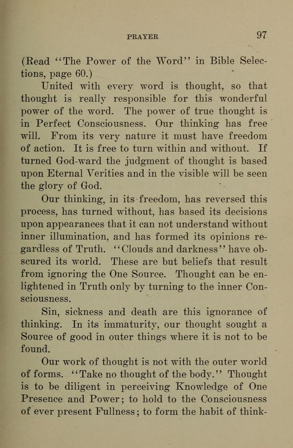 United with every word is thought, so that thought is really responsible for this wonderful power of the word. The power of true thought is in Perfect Consciousness. Our thinking has free will. From its very nature it must have freedom of action. It is free to turn within and without. If turned God-ward the judgment of thought is based upon Eternal Verities and in the visible will be seen the glory of God.
