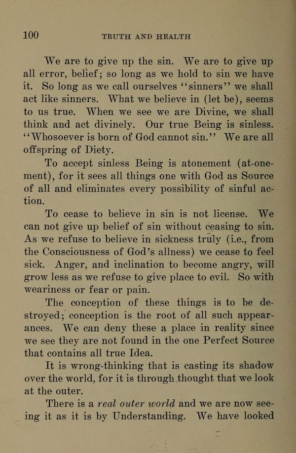We are to give up the sin. We are to give up all error, belief; so long as we hold to sin we have it. So long as we call ourselves "sinners" we shall act like sinners. What we believe in (let be), seems to us true. When we see we are Divine, we shall think and act divinely. Our true Being is sinless. "Whosoever is born of God cannot sin." We are all offspring of Deity.