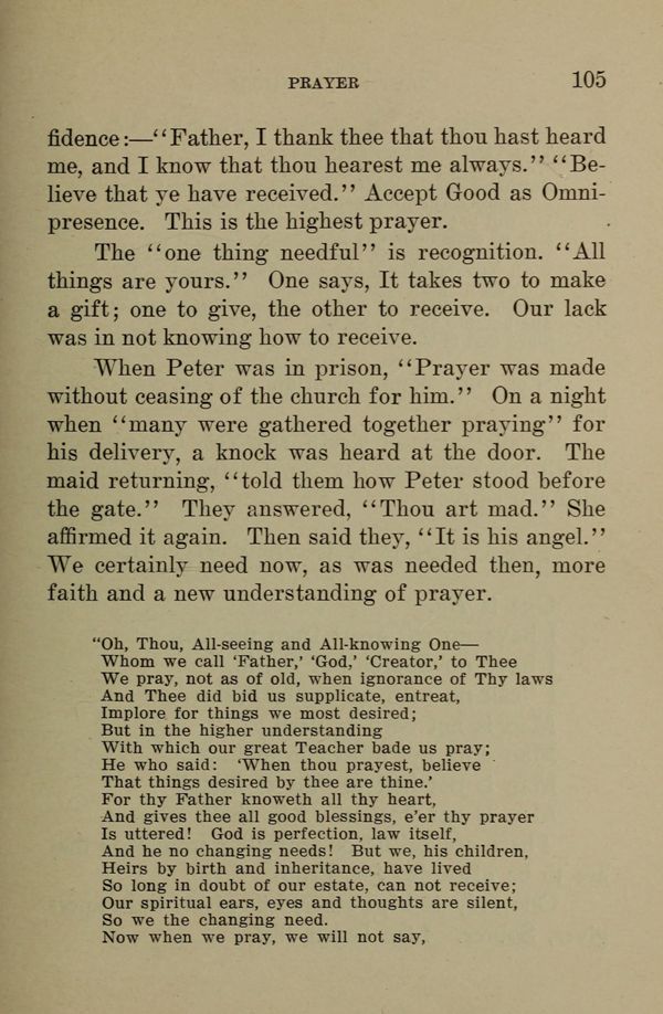"Oh, Thou, All-seeing and All-knowing One --- Whom we call 'Father,"God,"Creator,' to Thee We pray, not as of old, when ignorance of Thy laws And Thee did bid us supplicate, entreat, Implore for things we most desired; But in the higher understanding With which our great Teacher bade us pray; He who said: 'When thou prayest, believe That things desired by thee are thine.' For thy Father knoweth all thy heart, And gives thee all good blessings, e'er thy prayer Is uttered! God is perfection, law itself, And he no changing needs! But we, his children, Heirs by birth and inheritance, have lived So long in doubt of our estate, can not receive; Our spiritual ears, eyes and thoughts are silent, So we the changing need. Now when we pray, we will not say,