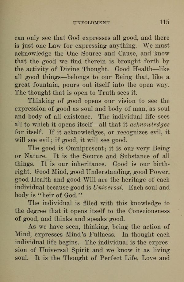 The good is Omnipresent; it is our very Being or Nature. It is the Source and Substance of all things. It is our inheritance. Good is our birthright. Good Mind, good Understanding, good Power, good Health and good Will are the heritage of each individual because good is Universal. Each soul and body is "heir of God."