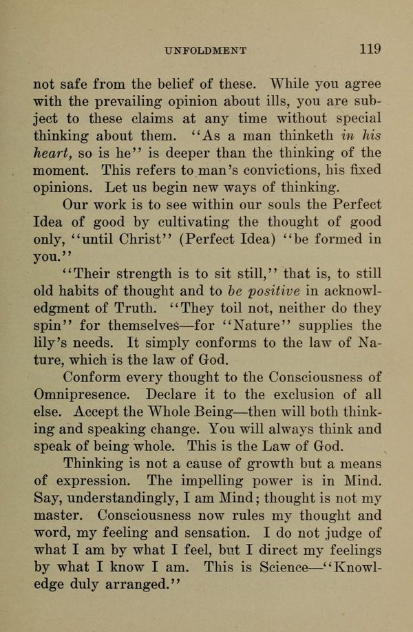not safe from the belief of these. While you agree with the prevailing opinion about ills, you are subject to these claims at any time without special thinking about them. "As a man thinketh in his heart, so is he" is deeper than the thinking of the moment. This refers to man's convictions, his fixed opinions. Let us begin new ways of thinking.