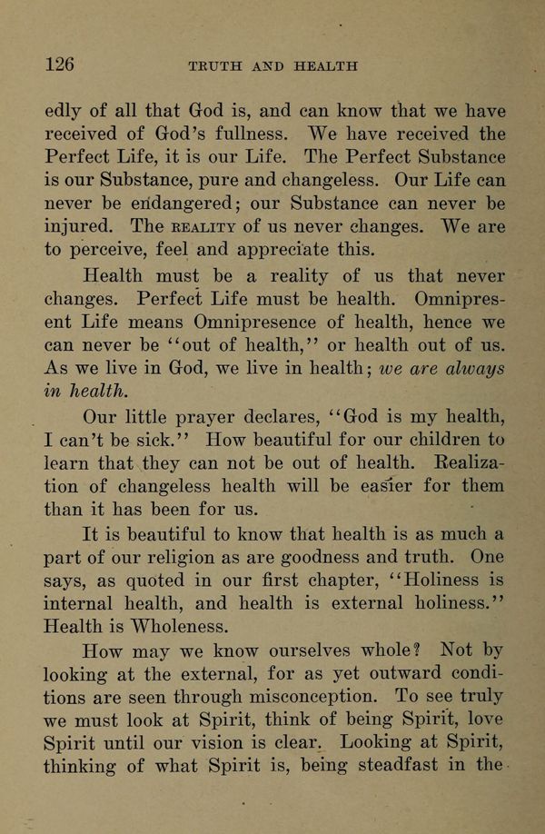 It is beautiful to know that health is as much a part of our religion as are goodness and truth. One says, as quoted in our first chapter, "Holiness is internal health, and health is external holiness." Health is Wholeness.