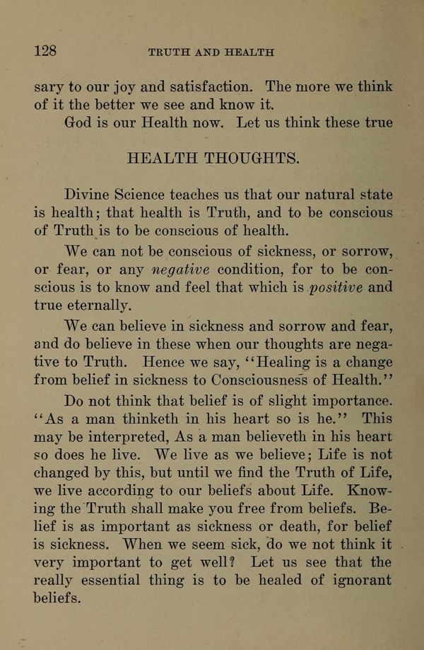 We can believe in sickness and sorrow and fear, and do believe in these when our thoughts are negative to Truth. Hence we say, "Healing is a change from belief in sickness to Consciousness of Health."
