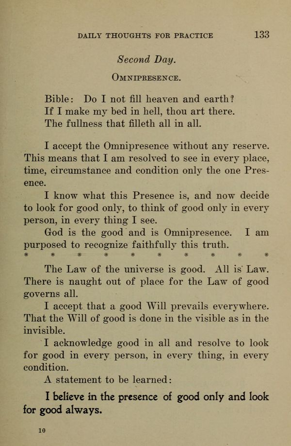 I accept the Omnipresence without any reserve. This means that I am resolved to see in every place, time, circumstance and condition only the one Presence.