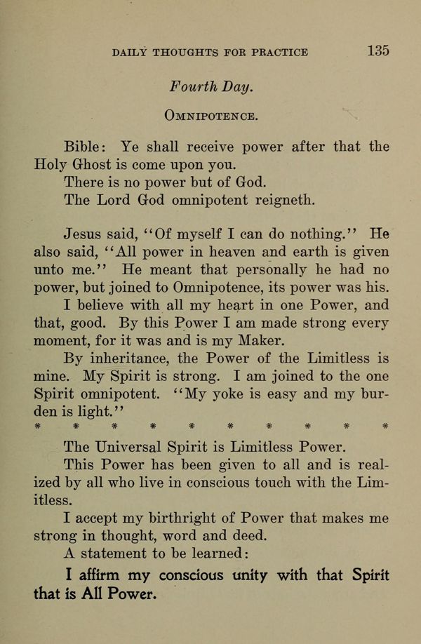 By inheritance, the Power of the Limitless is mine. My Spirit is strong. I am joined to the one Spirit omnipotent. "My yoke is easy and my burden is light." The Universal Spirit is Limitless Power.