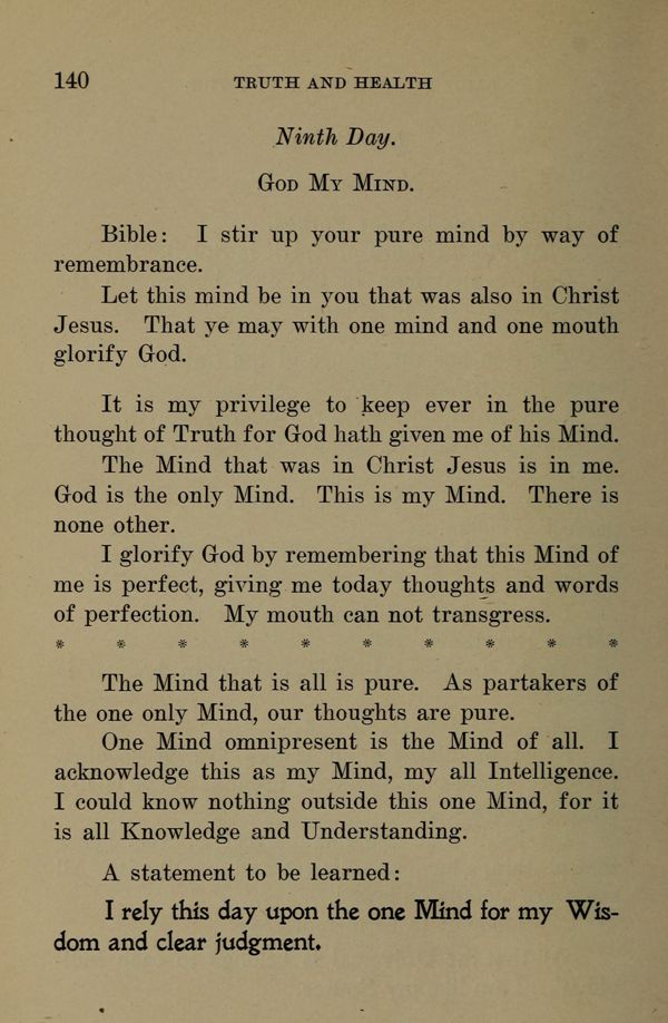 It is my privilege to keep ever in the pure thought of Truth for God hath given me of his Mind . The Mind that was in Christ Jesus is in me. God is the only Mind. This is my Mind. There is none other.