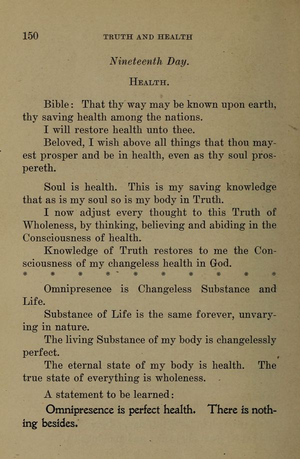 Knowledge of Truth restores to me the Consciousness of my changeless health in God.