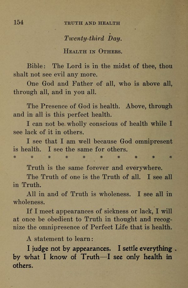 I judge not by appearances. I settle everything by what I know of Truth --- I see only health in others.