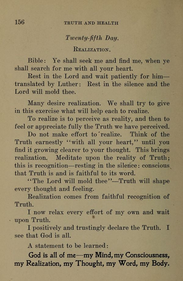 Do not make effort to realize. Think of the Truth earnestly "with all your heart," until you find it growing clearer to your thought. This brings realization. Meditate upon the reality of Truth; this is recognition --- resting in the silence: conscious that Truth is and is faithful to its word.