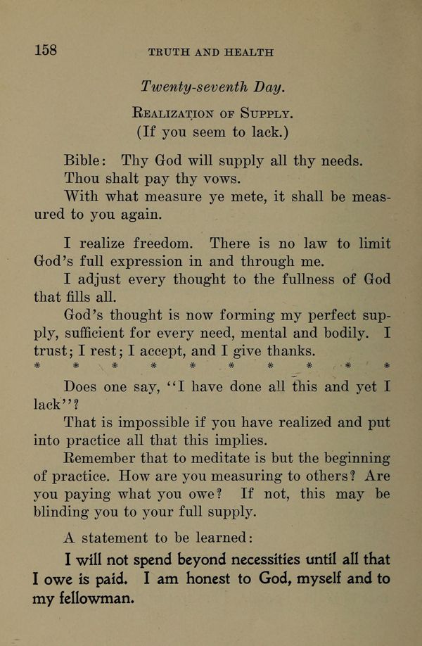 God's thought is now forming my perfect supply, sufficient for every need, mental and bodily. I trust; I rest I accept, and I give thanks.