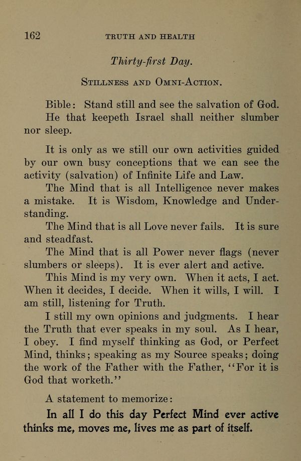It is only as we still our own activities guided by our own busy conceptions that we can see the activity (salvation) of Infinite Life and Law.