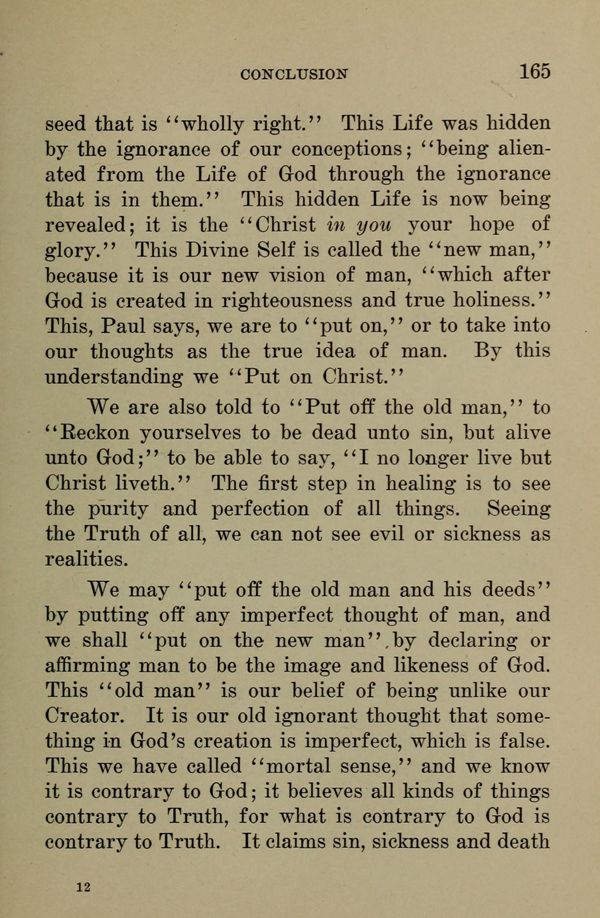 seed that is "wholly right." This Life was hidden by the ignorance of our conceptions; "being alienated from the Life of God through the ignorance that is in them." This hidden Life is now being revealed; it is the "Christ in you your hope of glory." This Divine Self is called the "new man," because it is our new vision of man, "which after God is created in righteousness and true holiness." This, Paul says, we are to "put on," or to take into our thoughts as the true idea of man. By this understanding we "Put on Christ."
