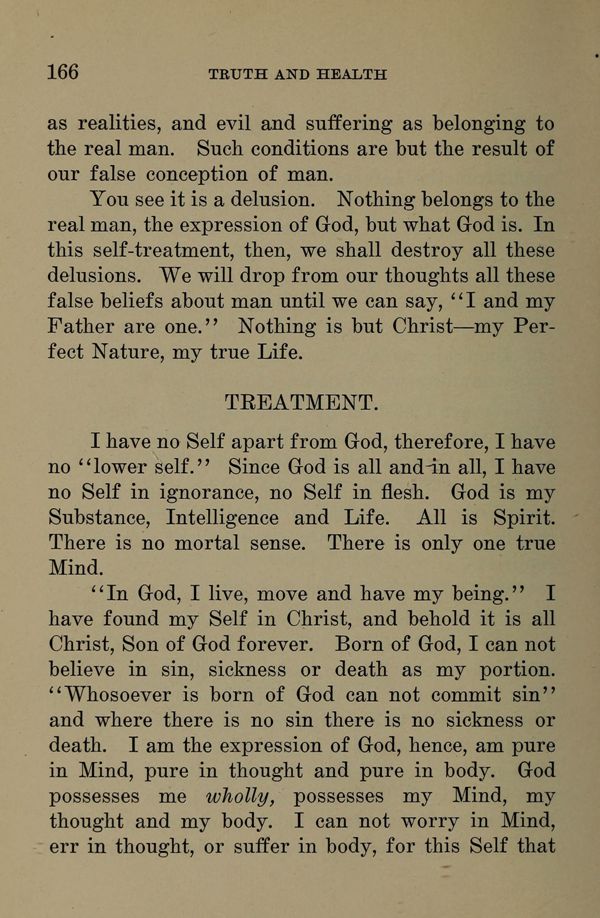 You see it is a delusion. Nothing belongs to the real man, the expression of God, but what God is. In this self-treatment, then, we shall destroy all these delusions. We will drop from our thoughts all these false beliefs about man until we can say, "I and my Father are one." Nothing is but Christ --- my Perfect Nature, my true Life.
