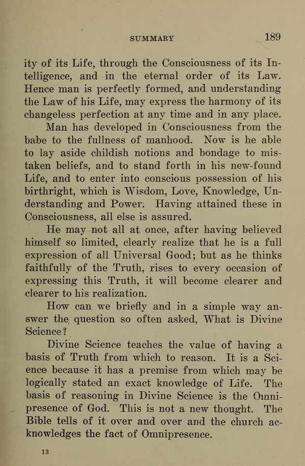 Divine Science teaches the value of having a basis of Truth from which to reason. It is a Science because it has a premise from which may be logically stated an exact knowledge of Life. The basis of reasoning in Divine Science is the Omnipresence of God. This is not a new thought. The Bible tells of it over and over and the church acknowledges the fact of Omnipresence.