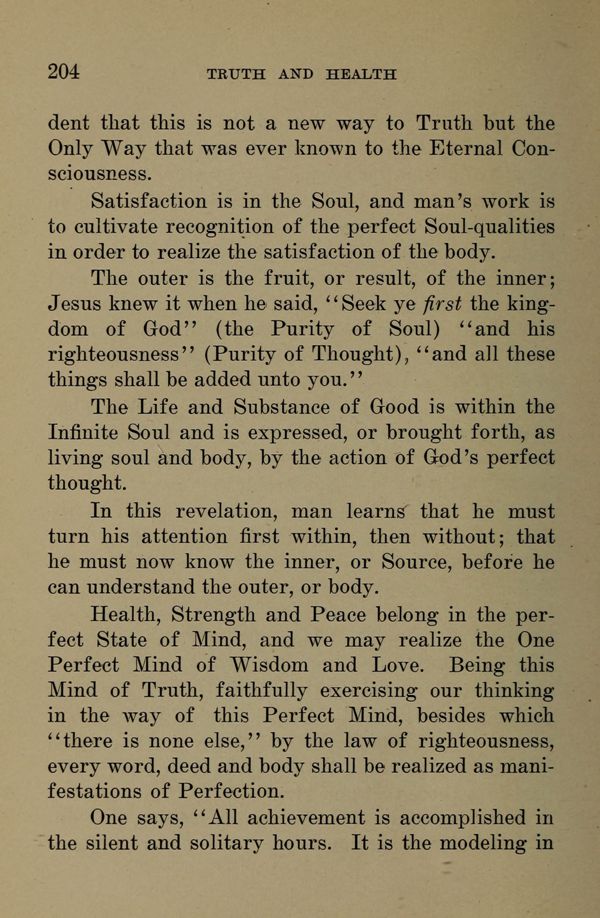 Satisfaction is in the Soul, and man's work is to cultivate recognition of the perfect Soul-qualities in order to realize the satisfaction of the body.