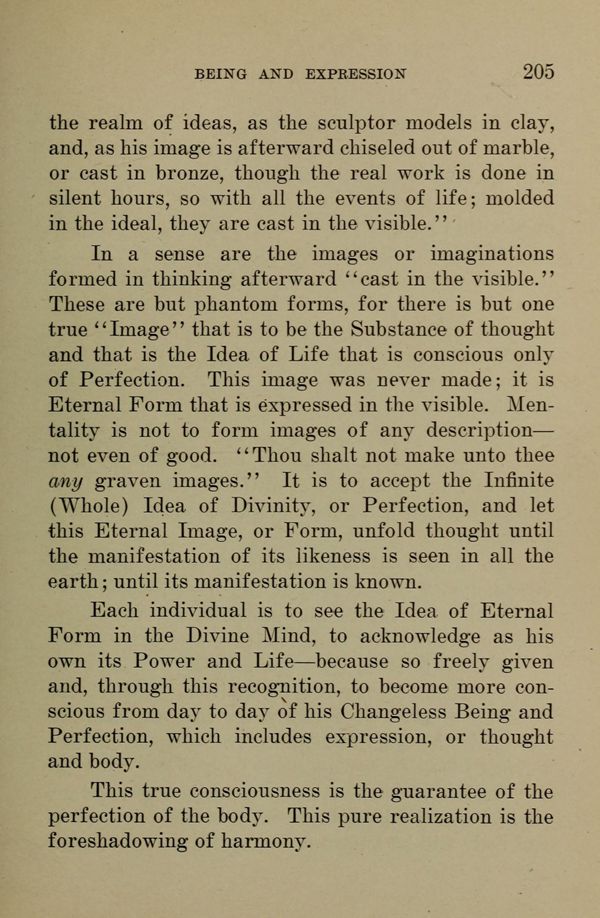 In a sense are the images or imaginations formed in thinking afterward "cast in the visible." These are but phantom forms, for there is but one true "Image" that is to be the Substance of thought and that is the Idea of Life that is conscious only of Perfection. This image was never made it is Eternal Form that is expressed in the visible. Mentality is not to form images of any description - not even of good. "Thou shalt not make unto thee any graven images." It is to accept the Infinite (Whole) Idea of Divinity, or Perfection, and let this Eternal Image, or Form, unfold thought until the manifestation of its likeness is seen in all the earth; until its manifestation is known.
