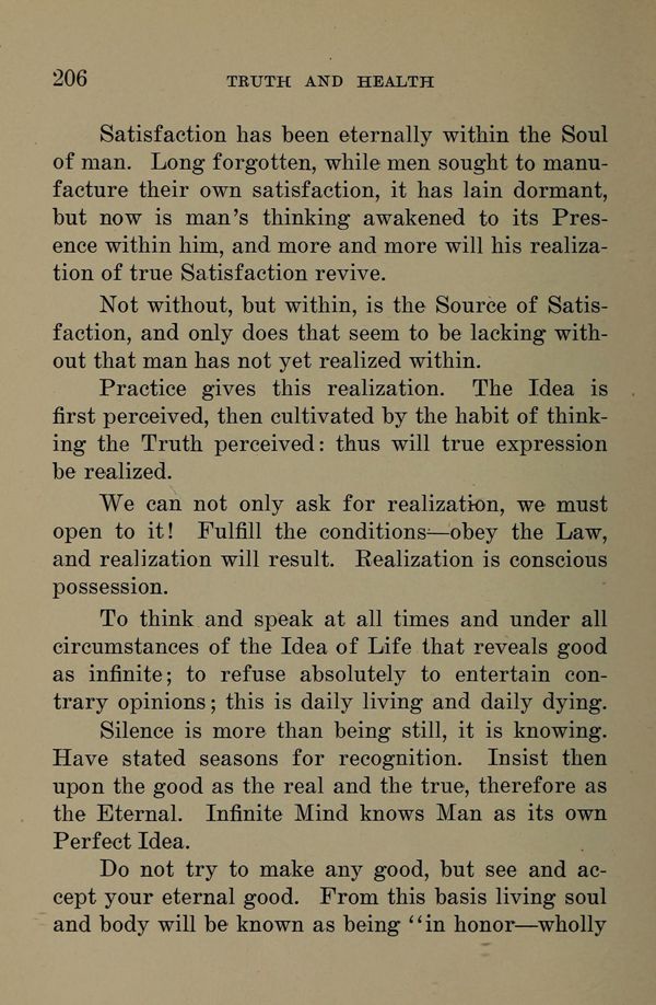 Satisfaction has been eternally within the Soul of man. Long forgotten, while men sought to manufacture their own satisfaction, it has lain dormant, but now is man's thinking awakened to its Presence within him, and more and more will his realization of true Satisfaction revive.