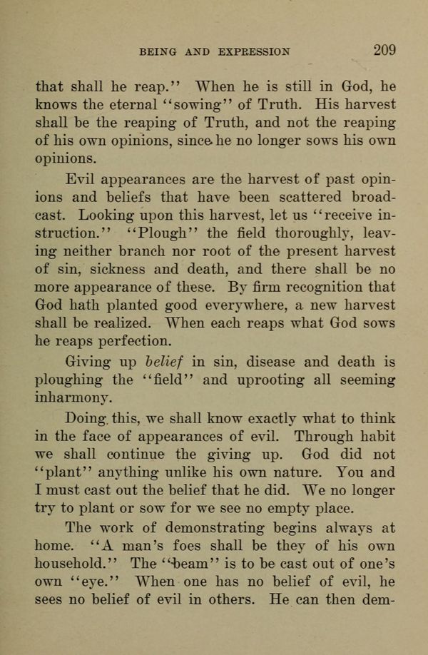 Evil appearances are the harvest of past opinions and beliefs that have been scattered broadcast. Looking upon this harvest, let us "receive instruction." "Plough" the field thoroughly, leaving neither branch nor root of the present harvest of sin, sickness and death, and there shall be no more appearance of these. By firm recognition that God hath planted good everywhere, a. new harvest shall be realized. When each reaps what God sows he reaps perfection.