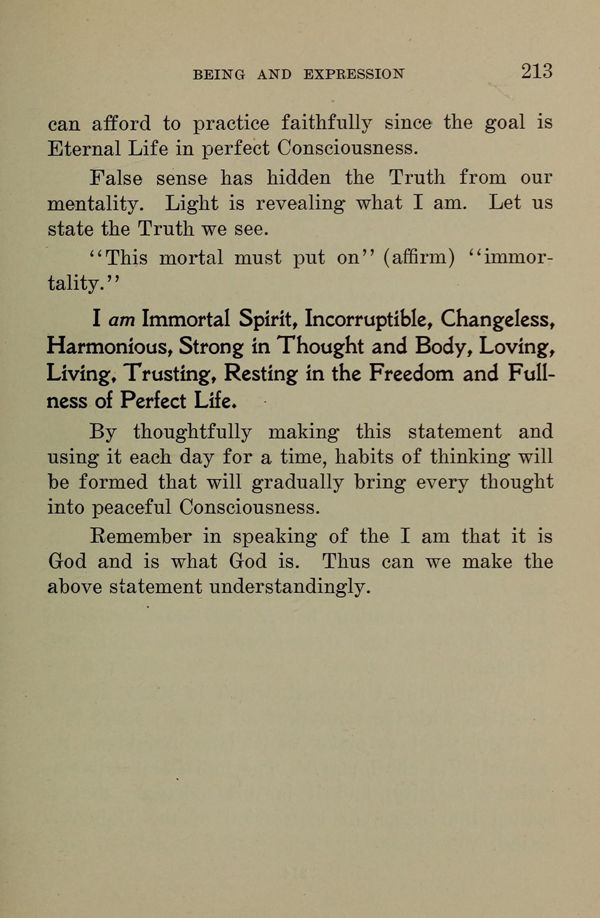 I am Immortal Spirit, Incorruptible, Changeless, Harmonious, Strong in Thought and Body, Loving, Living, Trusting, Resting in the Freedom and Fullness of Perfect Life.