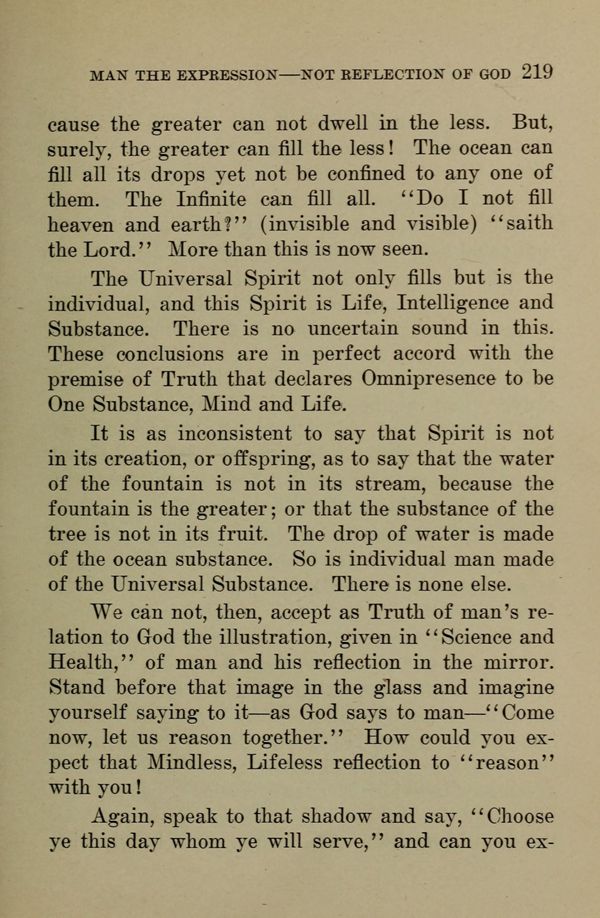 We can not, then, accept as Truth of man's relation to God the illustration, given in "Science and Health," of man and his reflection in the mirror. Stand before that image in the glass and imagine yourself saying to it --- as God says to man --- "Come now, let us reason together." How could you expect that Mindless, Lifeless reflection to "reason" with you!