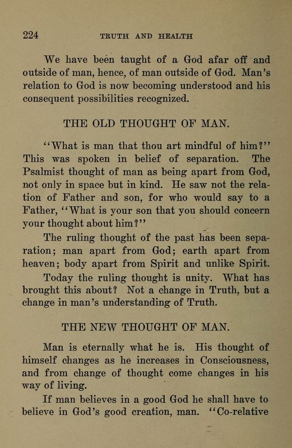 We have been taught of a God afar off and outside of man, hence, of man outside of God. Man's relation to God is now becoming understood and his consequent possibilities recognized.