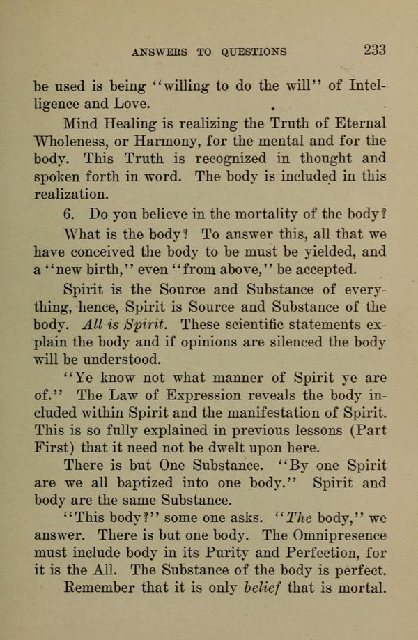Spirit is the Source and Substance of everything, hence, Spirit is Source and Substance of the body. All is Spirit. These scientific statement explain the body and if opinions are silenced the body will be understood.