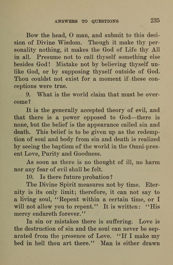 Bow the head, 0 man, and submit to this decision of Divine Wisdom. Though it make thy personality nothing, it makes the God of Life thy All in all. Presume not to call thyself something else besides God! Mistake not by believing thyself unlike God, or by supposing thyself outside of God. Thou couldst not exist for a moment if these conceptions were true.