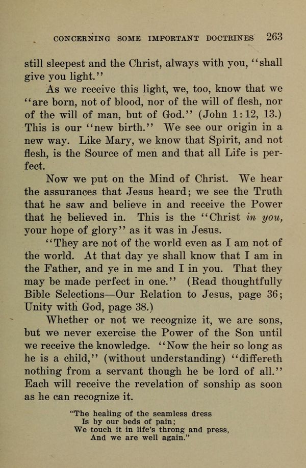 "They are not of the world even as I am not of the world. At that day ye shall know that I am in the Father, and ye in me and I in you. That they may be made perfect in one." (Read thoughtfully Bible Selections --- Our Relation to Jesus, page 36; Unity with God, page 38.)